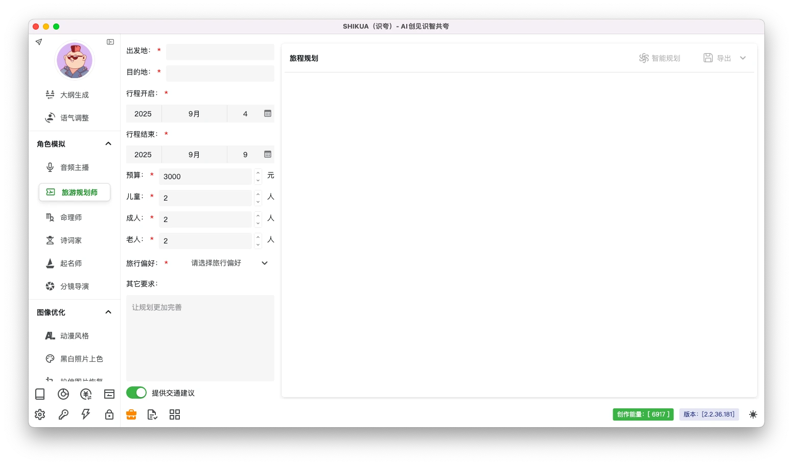 Fill in the departure city, destination, trip start and end dates, budget, group members, select travel preferences from the dropdown menu, and add any other requirements (optional). You can also choose whether to include transportation suggestions. Click “Smart Plan” to generate a table-style travel itinerary.